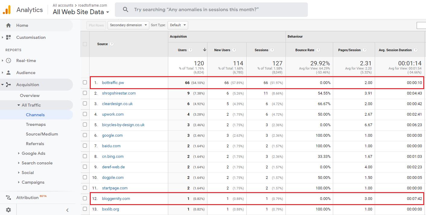 The screenshot below shows a small website with only 120 users. The top referrer — bottrffic.pw — is driving 66 users, more than 50% of overall users. If the domain name alone wasn’t enough to conclude that the traffic is spam, the metrics — 0% bounce rate, two pages/session, 66 users (all of which are new), and an incredibly short average session duration — certainly point to spam.