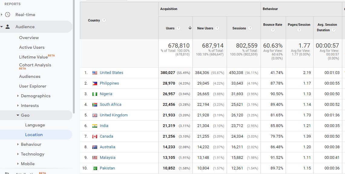 Some investigation proved the traffic was genuine. It was organic traffic from blogs. In this instance, you can accept that websites will occasionally reach audiences in different countries. If the data is not useful, Google Analytics provides an option to filter out traffic by country.