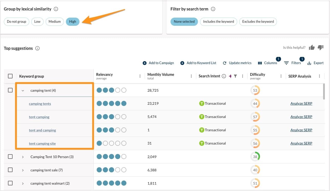2. Click High under Group by lexical similarity. This will create a list of targeted keywords by topic for your selected Search Intent. As you can see in the example below, we see a list of keywords to optimize a page for “camping tent” that meets Transactional Search Intent.