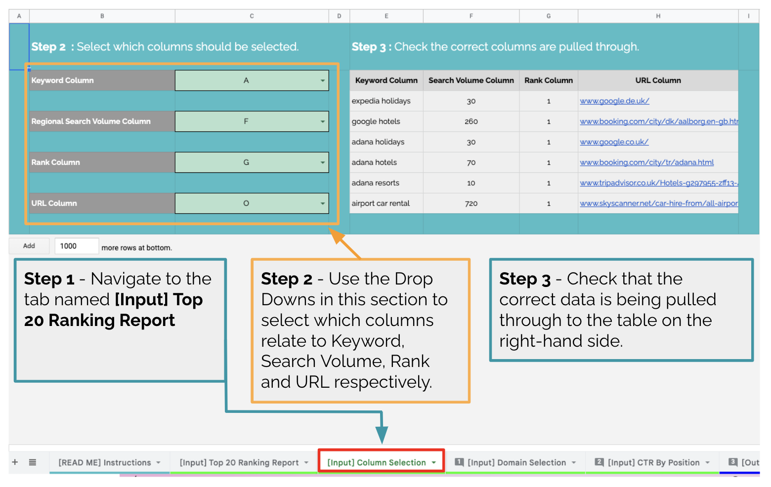 Import your top 20 report into the tab named [Input] Top 20 Ranking Report, pasting into cell A1. You should delete/override the existing dummy data. The top 20 ranking report can come from any rank tracking tool, for example STAT, Rank Ranger, Accuranker, Data For SEO, etc.