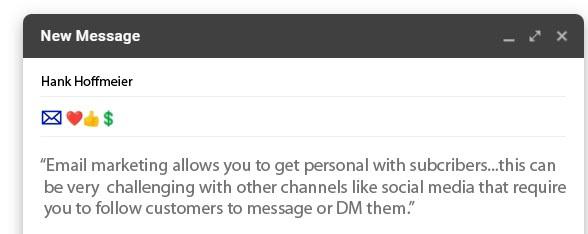 Hank: According to Demand Curve, email marketing has a higher ROI than any other form of publicity, can drive 6x more conversions than Twitter posting, and is 40 x more likely to be noticed than what a company posts on Facebook. Email marketing allows you to send the right message, to the right person, at the right time, at a ridiculously low cost. Stop throwing money at PPC and social media advertising that takes longer to convert and costs so much.
