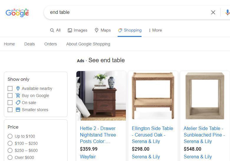 Meanwhile, Google’s increasingly powerful shopping environment largely defaults to massive and frequently virtual sellers unless the searcher filters results down with the “available nearby” or “smaller stores” option: