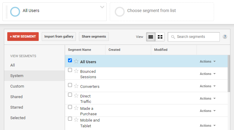 If you haven’t used segments yet in Universal Analytics, you’ll find these by clicking on the blue circle of “All Users”. You’ll also see a button for “Choose segment from list” when looking at virtually any report in Google Analytics.