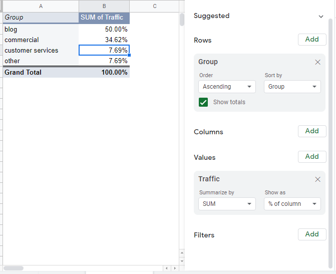 Here, I’ve created a new pivot table using the above data, using the “Group” as the rows, and “Traffic” as the values. I’ve then changed the traffic values to show as a percentage of the column instead of as a sum. This now shows me, in a quick snapshot, how much traffic is attributed to each page type. Using this method can help to segment your data and see how your pages perform based on their intent. Add metrics like conversion rates, phone calls and softer metrics to really understand what makes these pages tick.