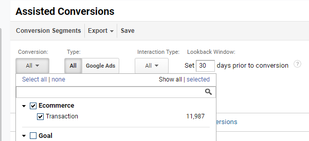 1. Change the conversions this report sees as a goal from “all” to sales, leads, etc. — whatever you deem as a conversion and are actively tracking. If you don’t change this setting, you’ll also be viewing all of your micro conversions that you’ve set as goals like video views or time on site.