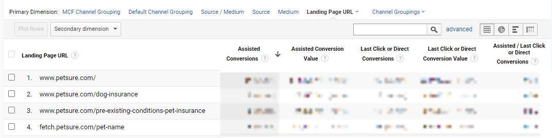 To get to your assisted conversions by landing page report in Google Analytics, you’ll need to go to Conversions > Multi-Channel Funnels > Assisted Conversions.