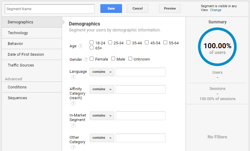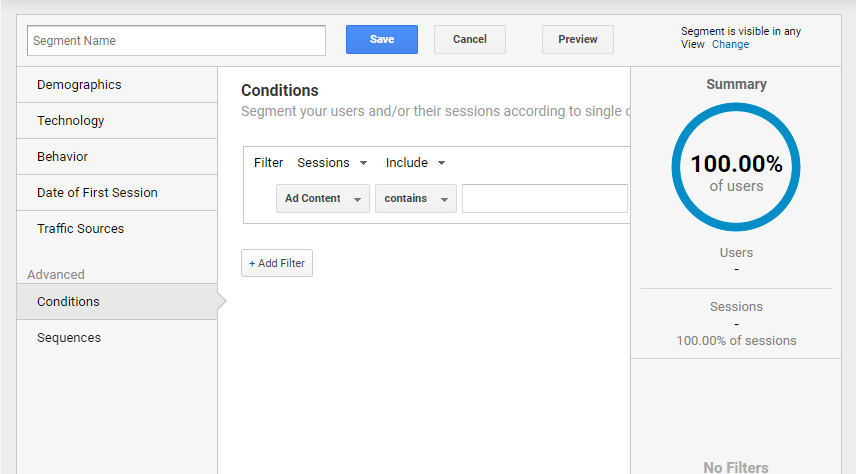 Creating custom segments in Universal Google Analytics allows you to pull out your data in a way that makes sense to you. It also allows you to quickly pull these segments into other reports, saving you countless hours.
