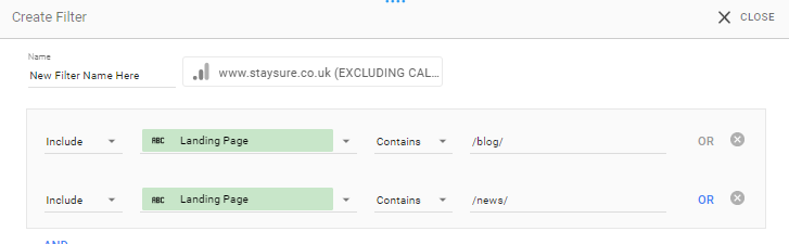 If you have both sections, then you can lump these together by using the “OR” function of the filter. This will then show you all of the data based on landing pages that contained either the /blog/ or /news/ in the hierarchy.