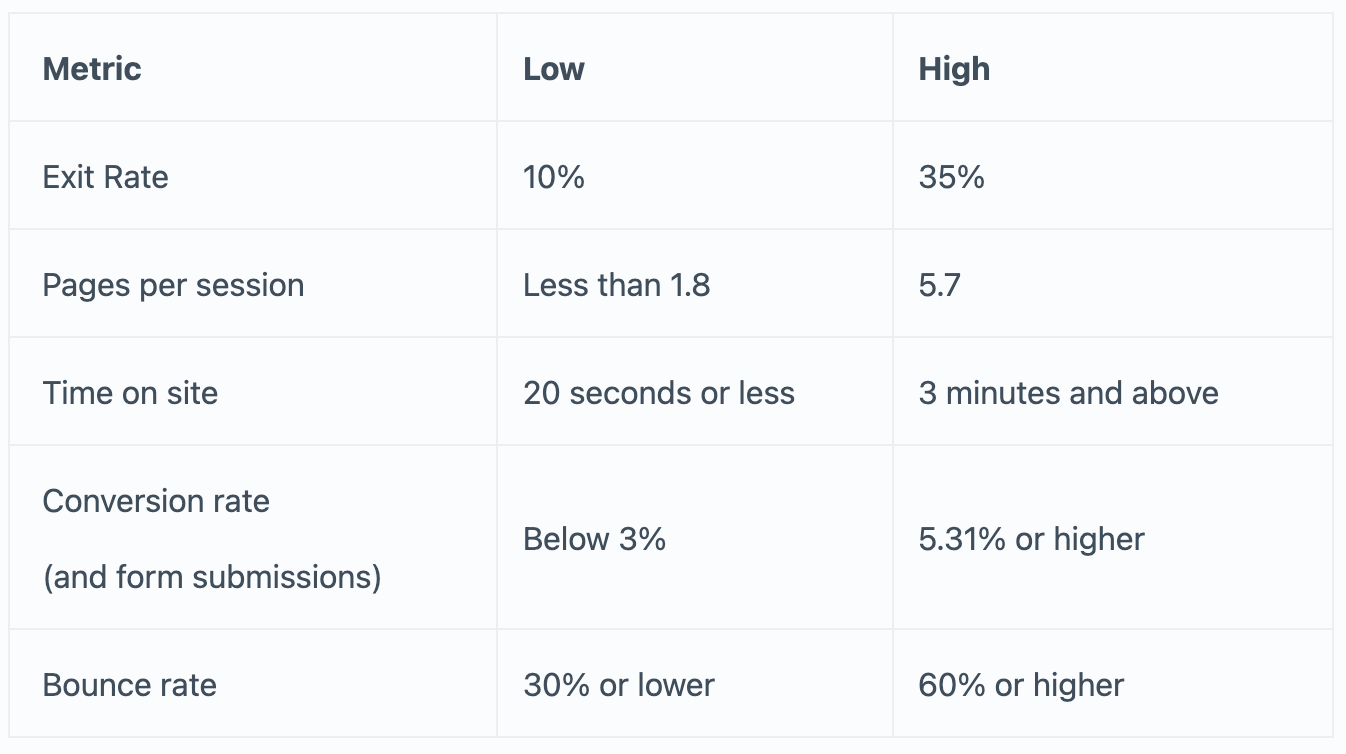 Let’s be honest here… you need benchmark data to truly understand how well your website is performing. I get it, we’re humans and we need guidelines! So in this section, I’ll cover low and high percentage rates for metrics discussed above.