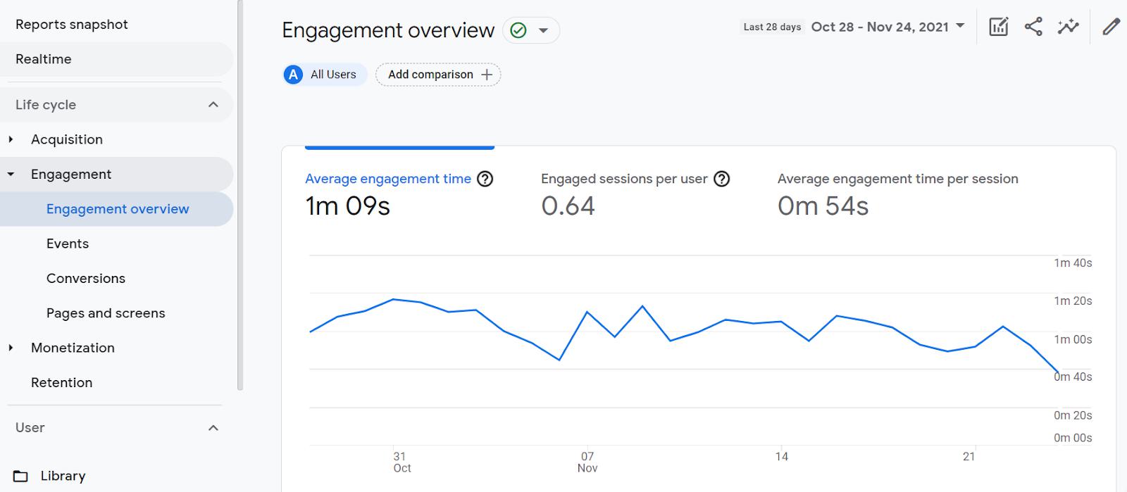 GA4 tags users who have either visited more than one page, completed an event or conversion, or who have been on the site longer than 10 seconds as “engaged users”. This metric will usually be higher than bounce rate, because certain sessions that would have been considered a bounce are now classified as an engaged user. The engagement overview on GA4 gives you an idea of how many of your users engage with your content and for how long, which is a useful substitute for the GA bounce rate metric.