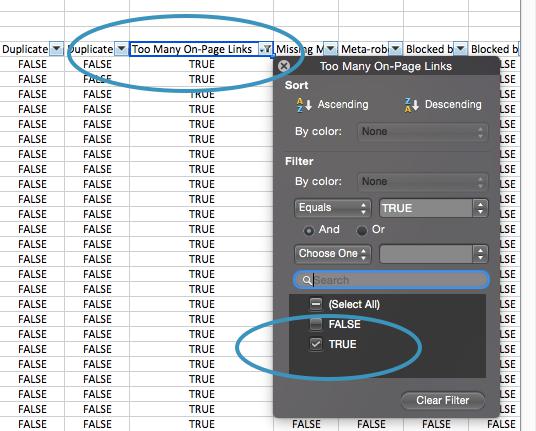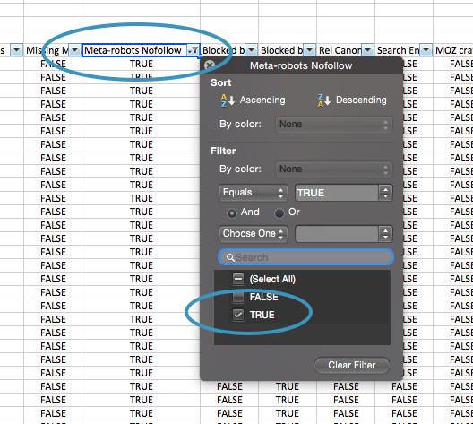 On your own site nofollow links can be marked on a link-by-link basis, or a whole page on your site can be allocated as nofollow. Let’s find the "Meta-robots Nofollow" column in your crawl CSV and filter by TRUE to check if you intended to mark these pages as nofollow.