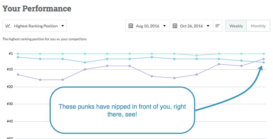 Here's a little bundle of keywords that I can investigate. I’ll click on the keyword to open up the Analysis report and scroll down to "Your Performance." Now we can see a historical graph of your rankings and track those other sites who want to push us to one side. And what do we have here?