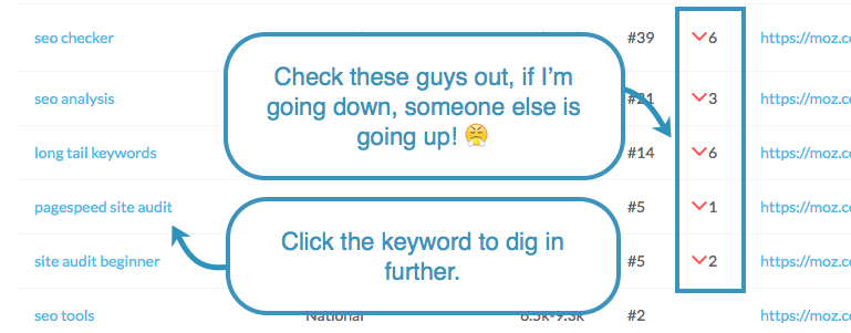 Let’s find some keywords that have that sad little down arrow, meaning we’ve dropped down in rankings since our last update.