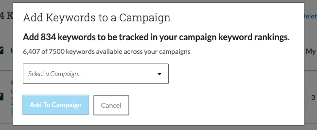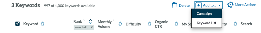 If you already have a Campaign running you can also transfer these straight over from Keyword Explorer. Just check the box next to the keywords you want to track, then choose a Campaign from the drop down.