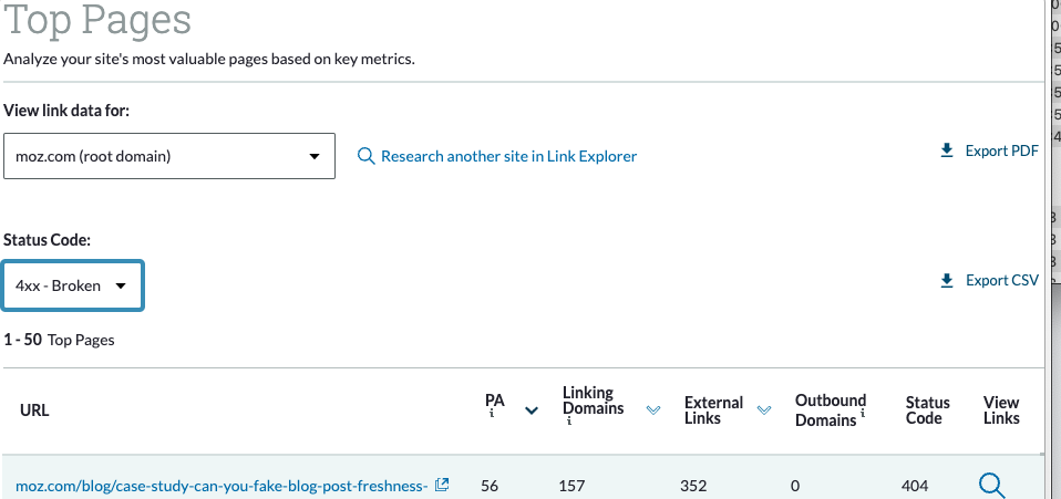 Now here's a list of broken pages , ordered by Page Authority that have inbound links. Pages on your site that are down aren’t passing value — not to mention it’s less than ideal user experience. You can prioritize the pages with the highest PA and amount of linking domains.