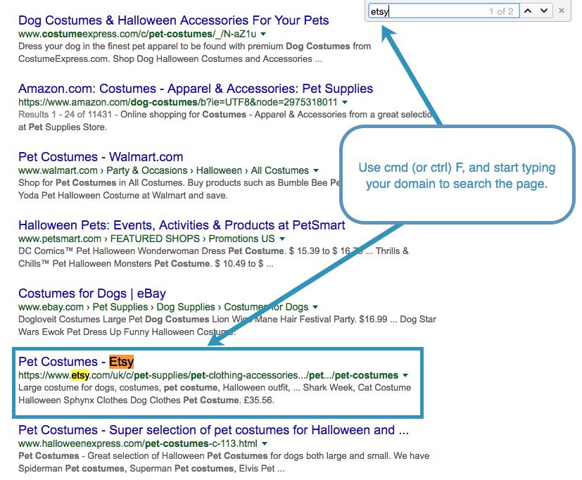 Now we’ve got a whole page of 50 or 100 results to search through. Use CMD + F for Mac (or CRTL + F for Windows) to search for your domain.