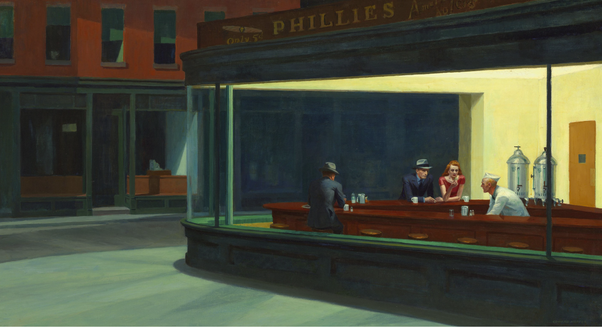 And Hopper’s “Nighthawks”, set in a Greenwich Village diner, has become one of the most-recognized paintings in American art history. Looking at it 80 years after it was painted, it evokes a feeling in me of the value of local businesses keeping the light on in hard times: