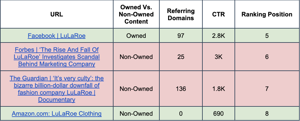 When researching LuLaRoe, we saw that both the Forbes and The Guardian articles were ranking at the bottom of their page one search results, just below their Facebook page and just above their Amazon Storefront profile listing. We recorded what each link was, the position it was ranking in, and the sentiment of each for the first 30 results we found.