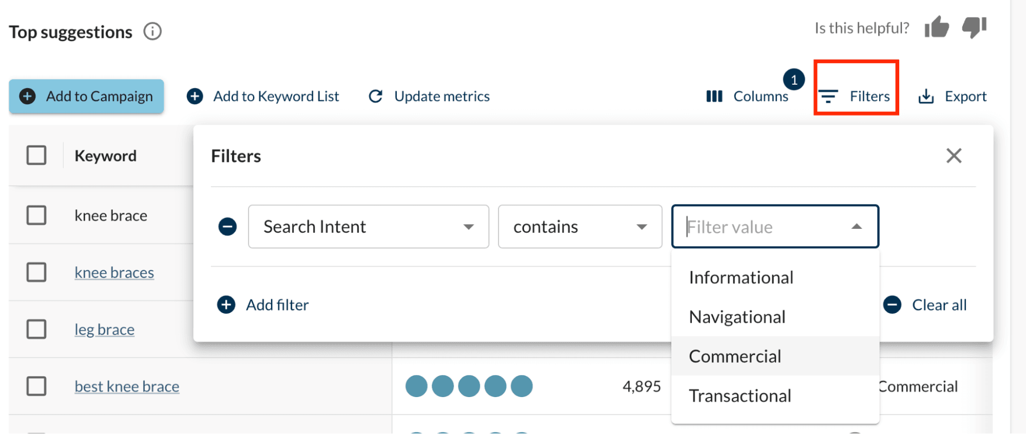 For example, the filtered result shows many informational keywords related to customers' pain points when searching for knee braces. Add these to your keyword list.