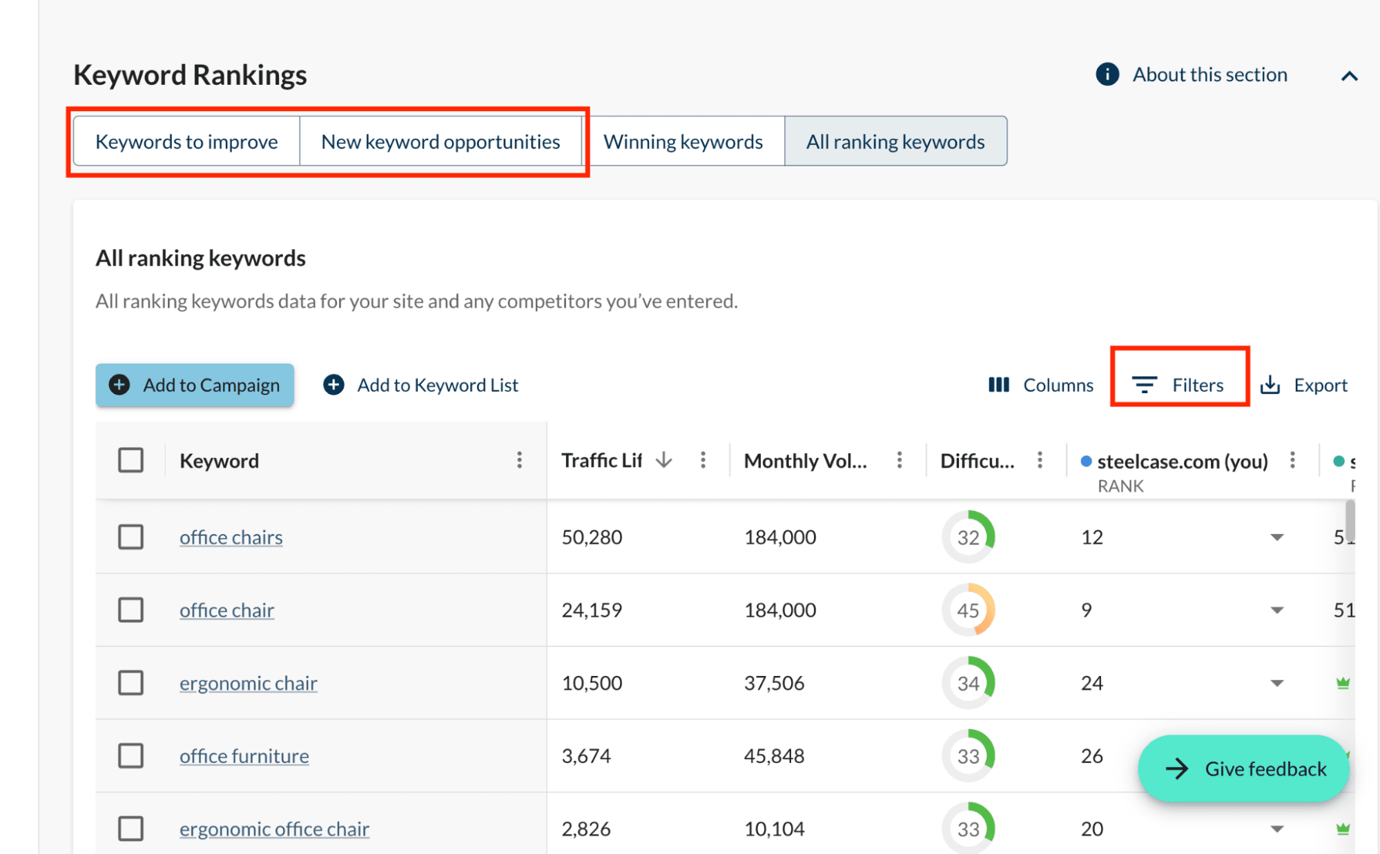 Limit your search results to keywords to improve and new keyword opportunities. Then, populate your keyword list using the filtering options we discussed in the previous step.