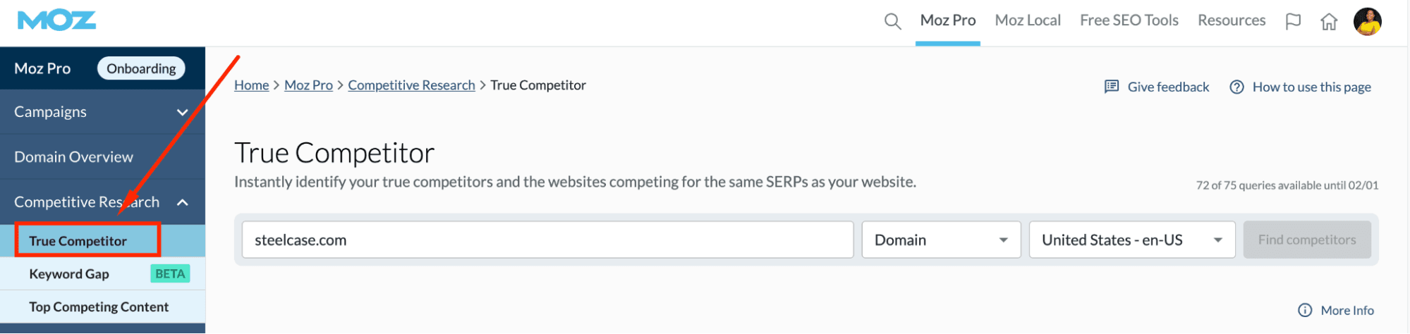 If you don’t know your competitors, use Moz’s True Competitor to identify websites ranking for your desired keywords in Search Engine Results Pages.