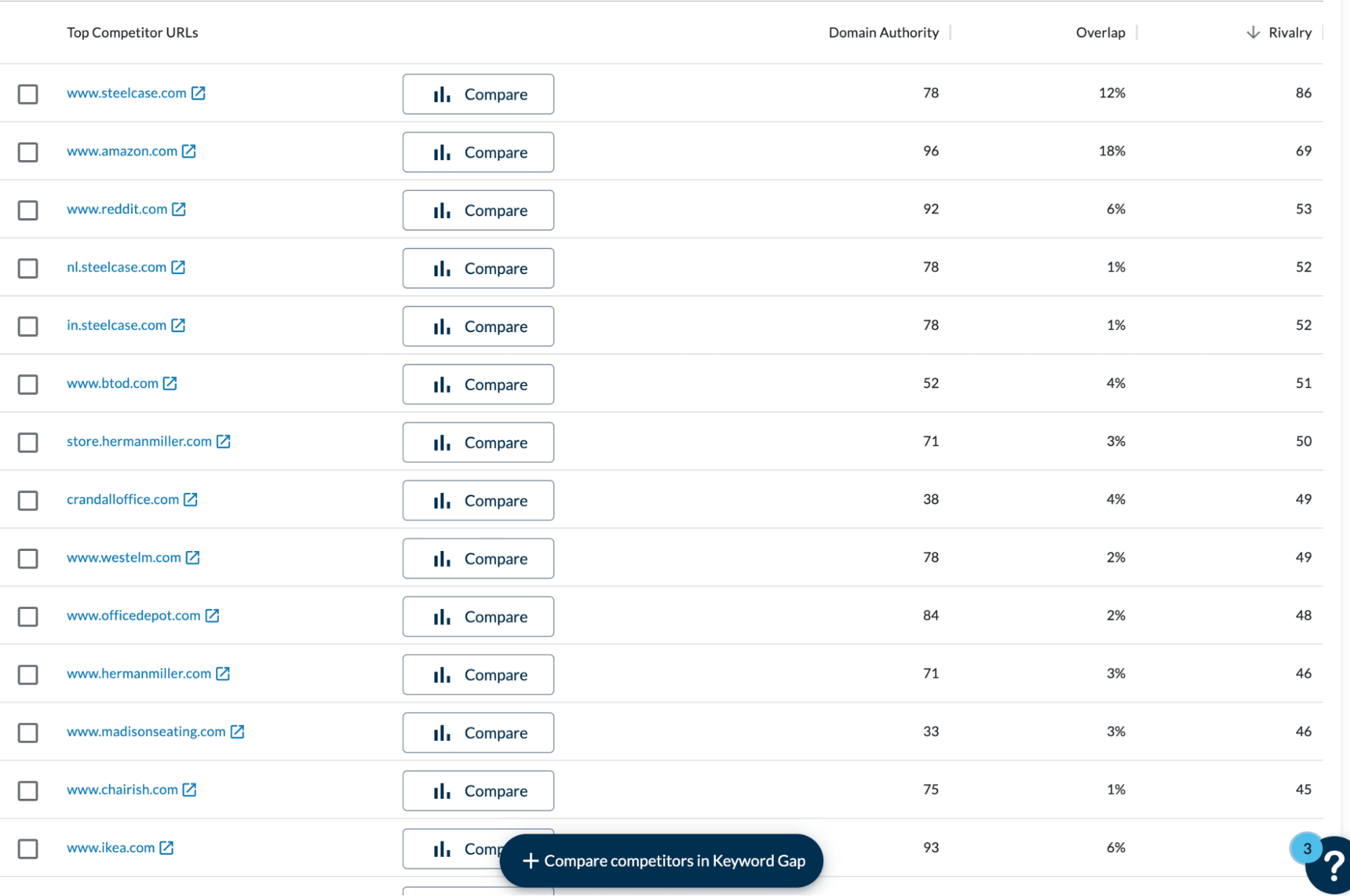 While large websites like Amazon might have a larger keyword overlap, I recommend choosing niche websites like Herman Miller and Office Depot, which focus more on office furniture and supplies.
