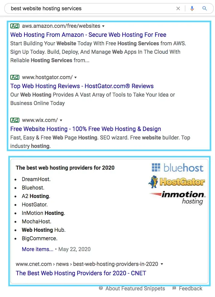 In the example below, the organic results compare product features between competing site hosts rather than explaining what site hosts are and how they function.