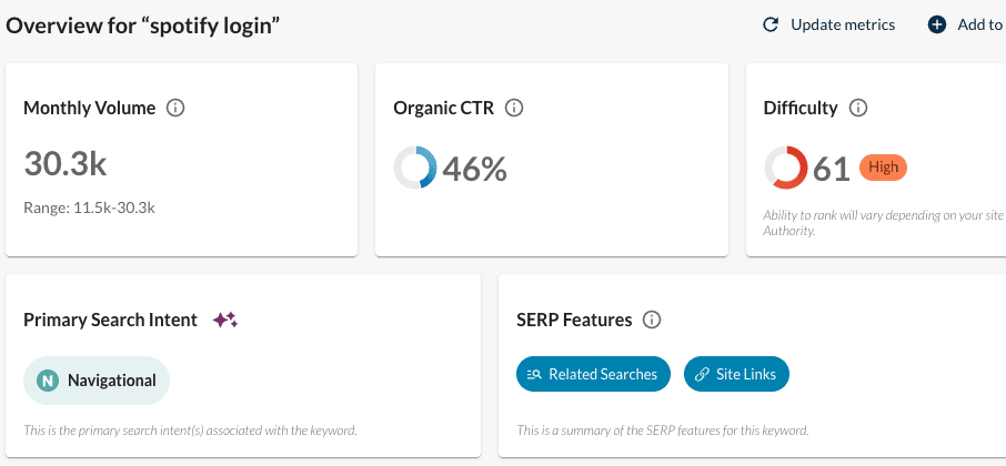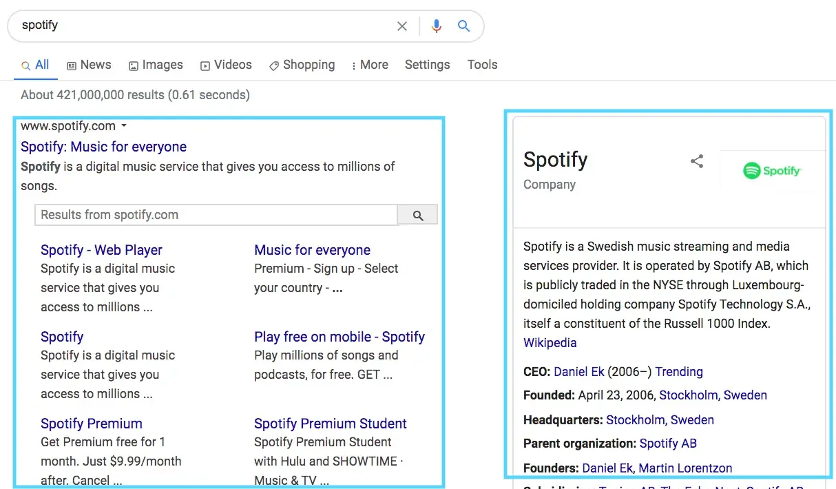 Since users with navigational intent already know which website they’re looking for, these results usually feature the most relevant page at the top: e.g. if the user searches “Spotify”, Spotify’s homepage will be the first result, whereas the login page will take first position for “Spotify login.”
