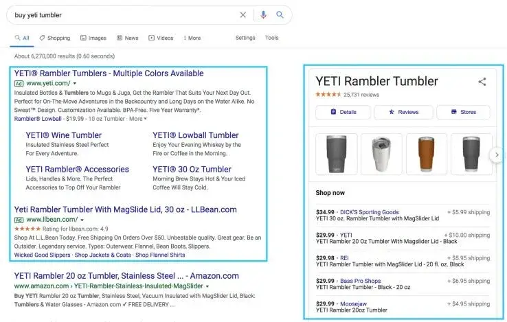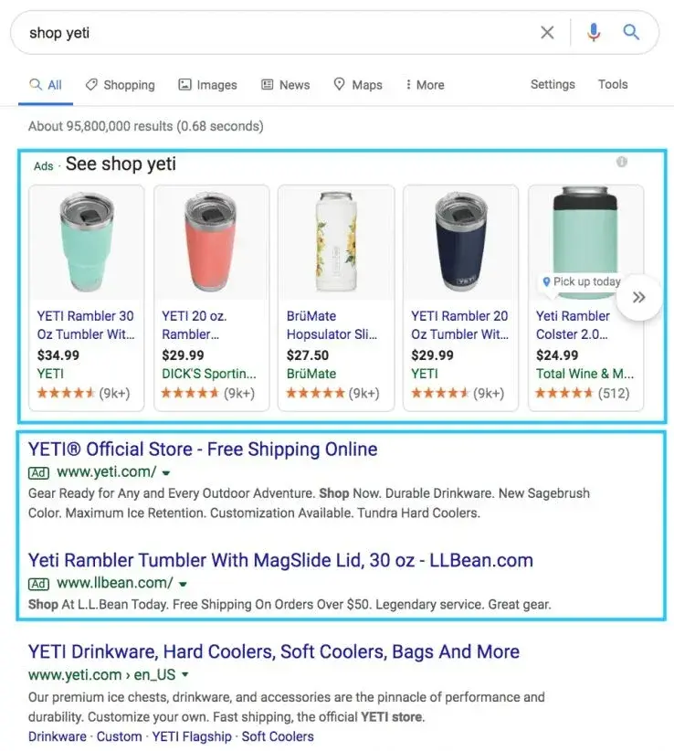 Preferential intent is similar in that results may include a featured snippet, but they’ll also include paid results at the top of the SERP. The results will also likely provide information about the brands searched rather than topical information.