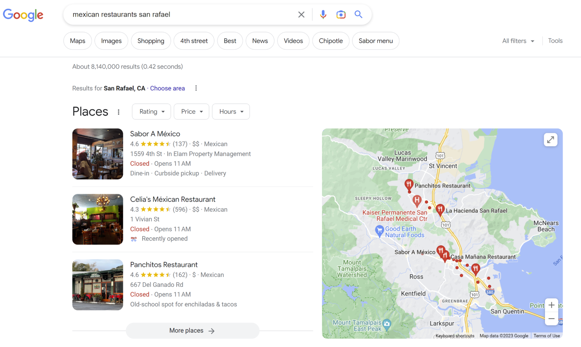 For example, you might discover that when you search for “tacos”, Google is casting a very narrow net for local results, showing restaurants mainly clustered in a single neighborhood of your city. But when you change your search to “organic vegan tacos”, suddenly Google is widening the net to encompass the whole city or even reaching beyond city boundaries. That’s amazing business intelligence because it shows you opportunities to optimize for more specific terms and show up for more distantly-located customers. Use this knowledge in choosing your: