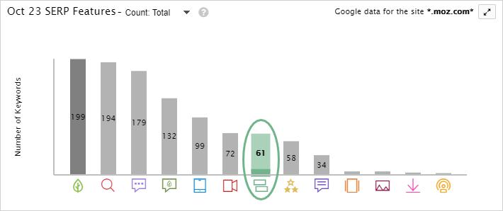 You can quickly get an overview of indented results for your site by clicking on the “SERP Features” tab. You’ll see the indented results icon (two green rectangles, with one indented) in both the legend and the SERP Features graph, which you can view by share of voice or total count:
