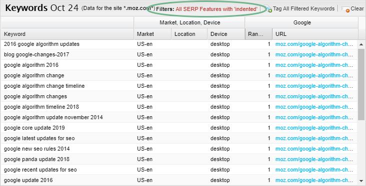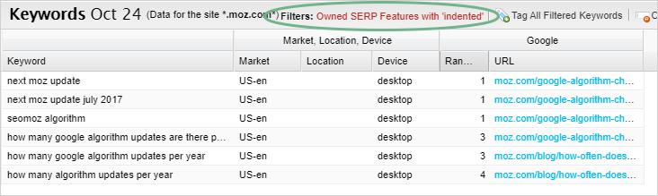 Just click on the double-rectangle icon, and you’ll automatically get back a list of all keywords in your current tracked site that have indented results: