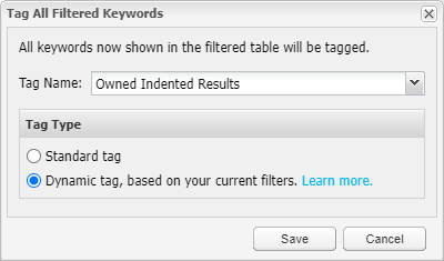 Click on “Tag All Filtered Keywords” above the keyword list, and you’ll get a dialog box like the one below. Just select “Dynamic tag”, give your tag a name, and click [Save] ...