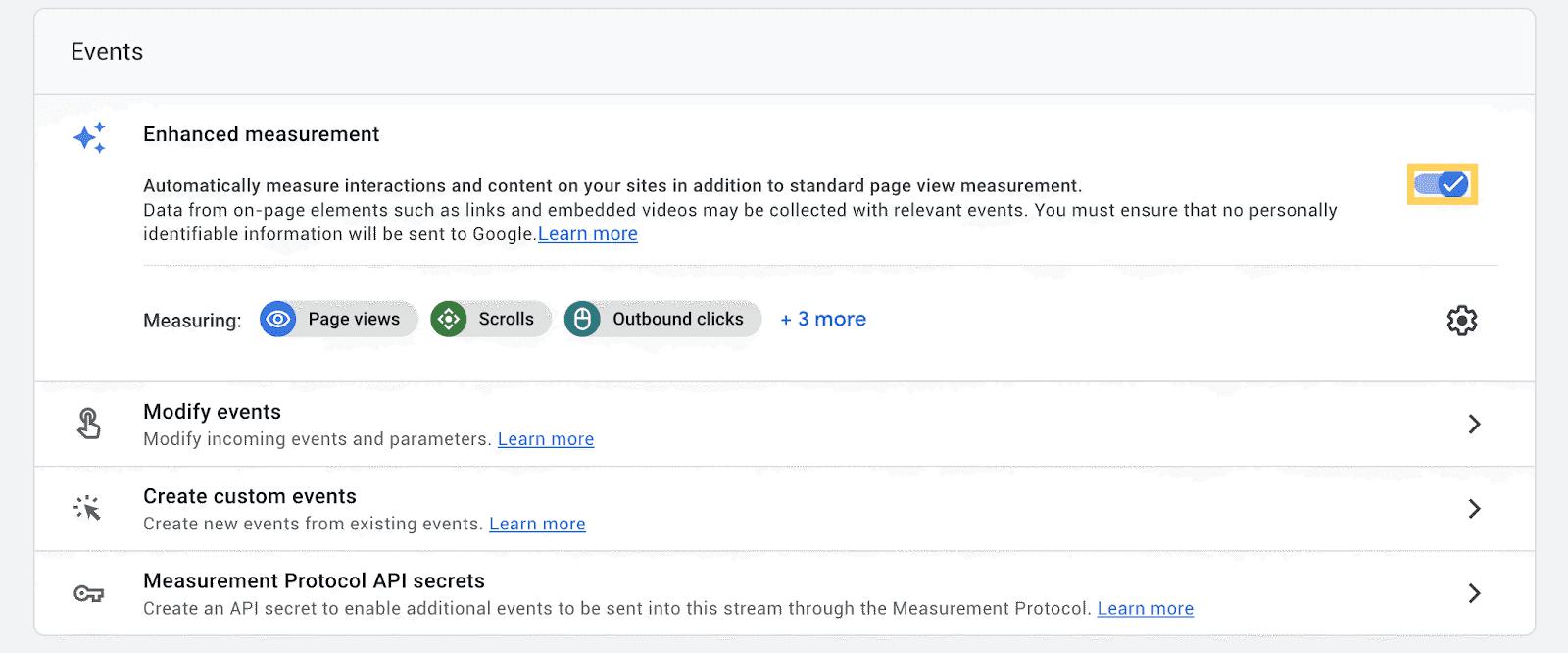 But first, you’ll need to make sure you’re set up to track site searches. In most cases, you’ll need to enable enhanced measurement in GA4, which you can do by going to Admin > Data Streams > Web stream details and then clicking the Enhanced Measurement toggle.