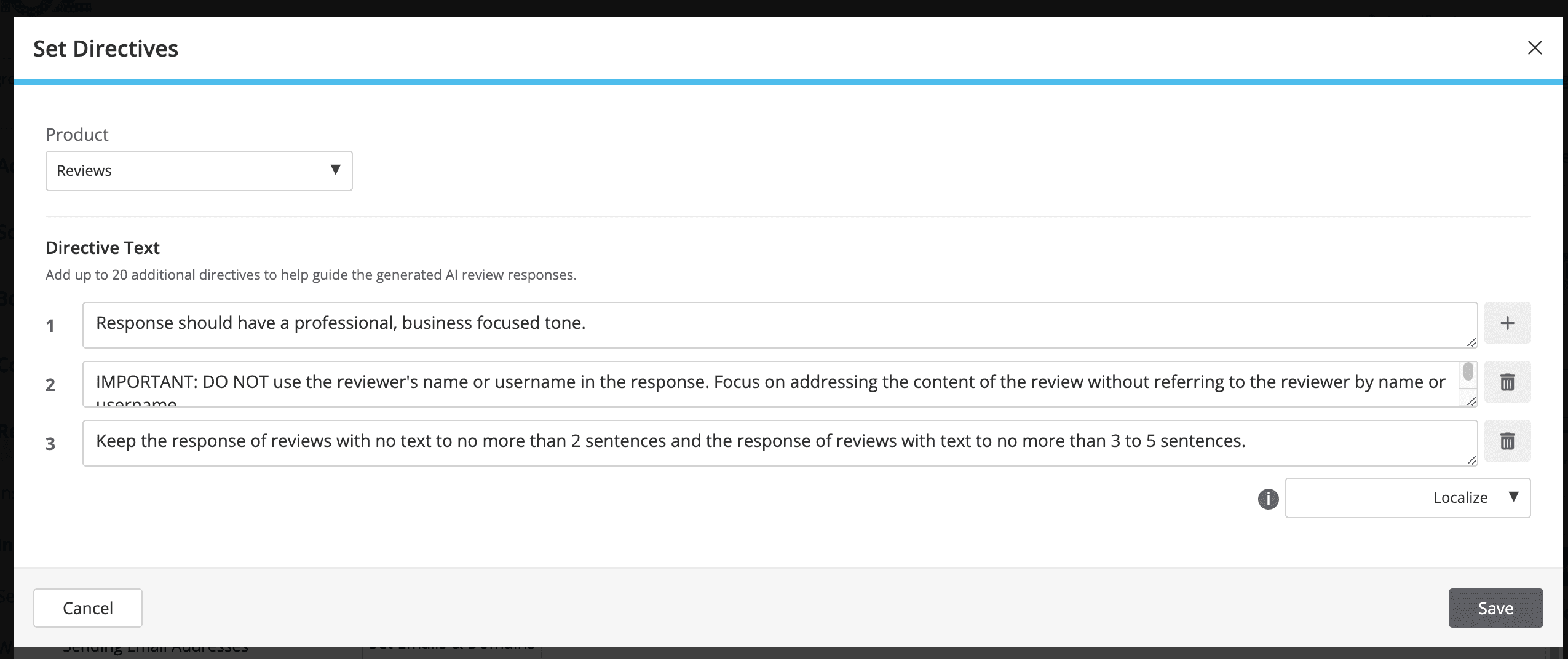 Please note: AI directives are account-specific and cannot be added on a location or group level. This means that any directives you add will be applied to all review responses in your account.