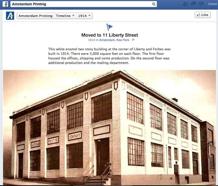 Another creative visual use of Facebook is by Amsterdam Printing, which uses the Facebook Timeline to showcase its company history, complete with photos and descriptions of key events in its 115 years in business.