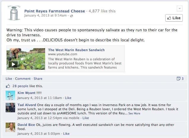 Don’t forget about embedding videos in your posts, either! Here’s a great example from Point Reyes Cheese of the production of a sandwich that includes their cheese. Note the great teaser that piques fans’ curiosity and encourages them to click through.