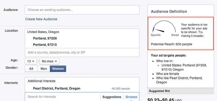 Due to its treasure trove of demographic information (including interests, employment history, age, and relationship status) and geographic targeting ability (down to the ZIP code level), Facebook allows small businesses to be extremely targeted with both the type of customer they’re trying to attract and their budgets.