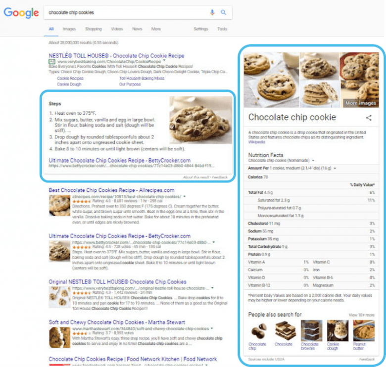 You can see the knowledge graph in action on the results page yielded upon searching for “chocolate chip cookies.” The SERP does contain standard organic results and links to suitable websites, but it also contains a rich set of knowledge graph data, including an answer box with a recipe, a right-hand knowledge panel featuring nutritional facts about this dessert, and suggestions for related search subjects.