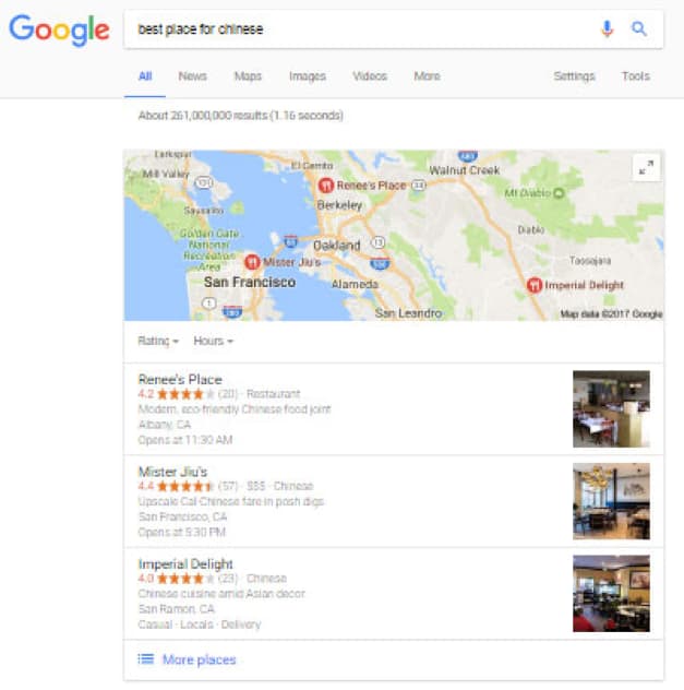 Semantic search is a complex topic, so here’s another example of how this works on the web. Imagine that a Google user types or speaks this search engine query: best place for chinese. It’s only by understanding the intent context of such a query that Google can identify “place” as signifying a restaurant and “Chinese” as signifying a specific type of restaurant food.