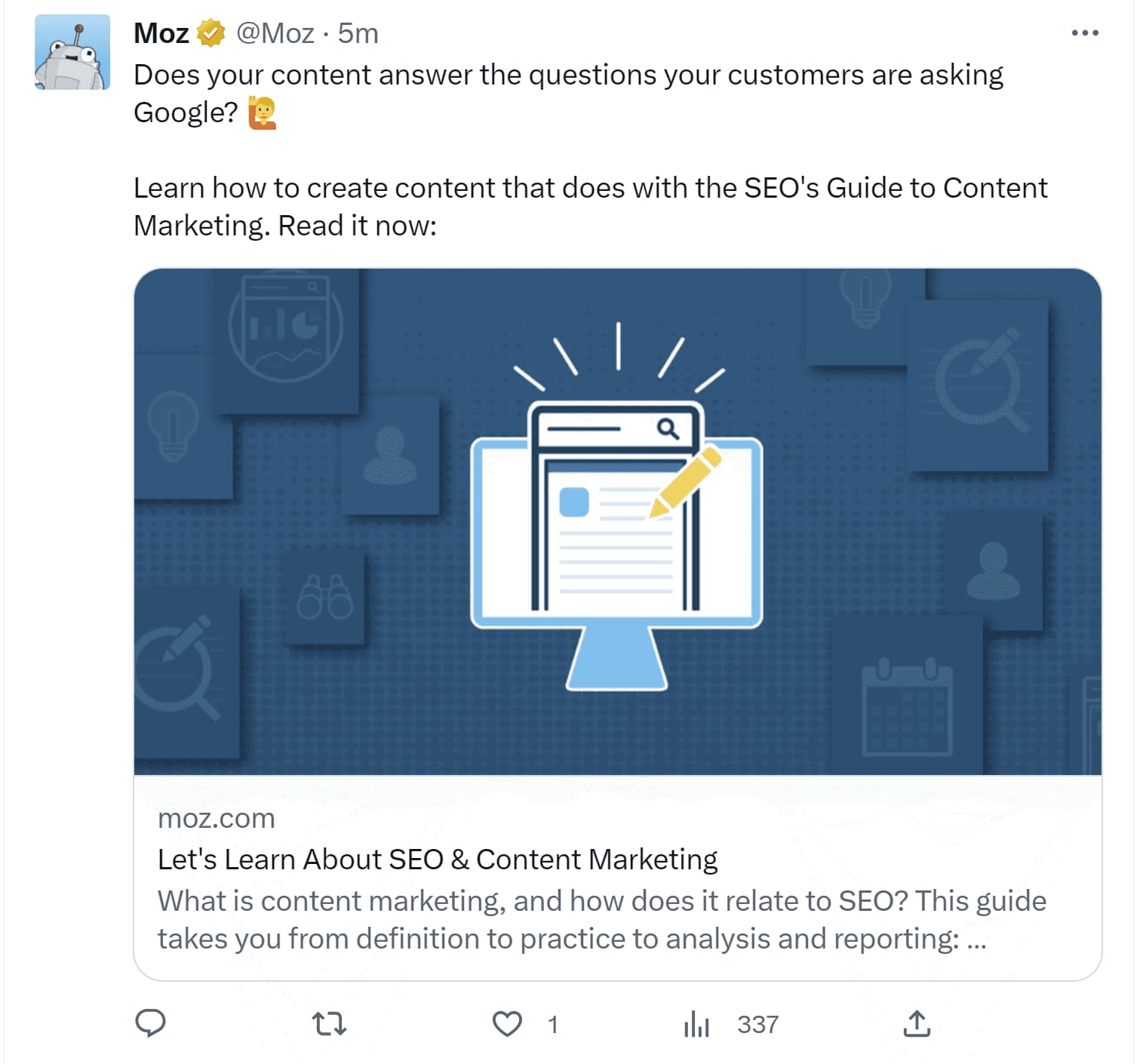 When sharing a page, the title tag is often used as the headline in the preview snippet. Crafting a perfect title tag is crucial for better engagement on social media. As seen in this example of a social post on Twitter, the title tag of “Let’s Learn About SEO & Content Marketing” is pulled from the page when the link to that page is tweeted. Different social platforms have slightly different formatting for this type of display: