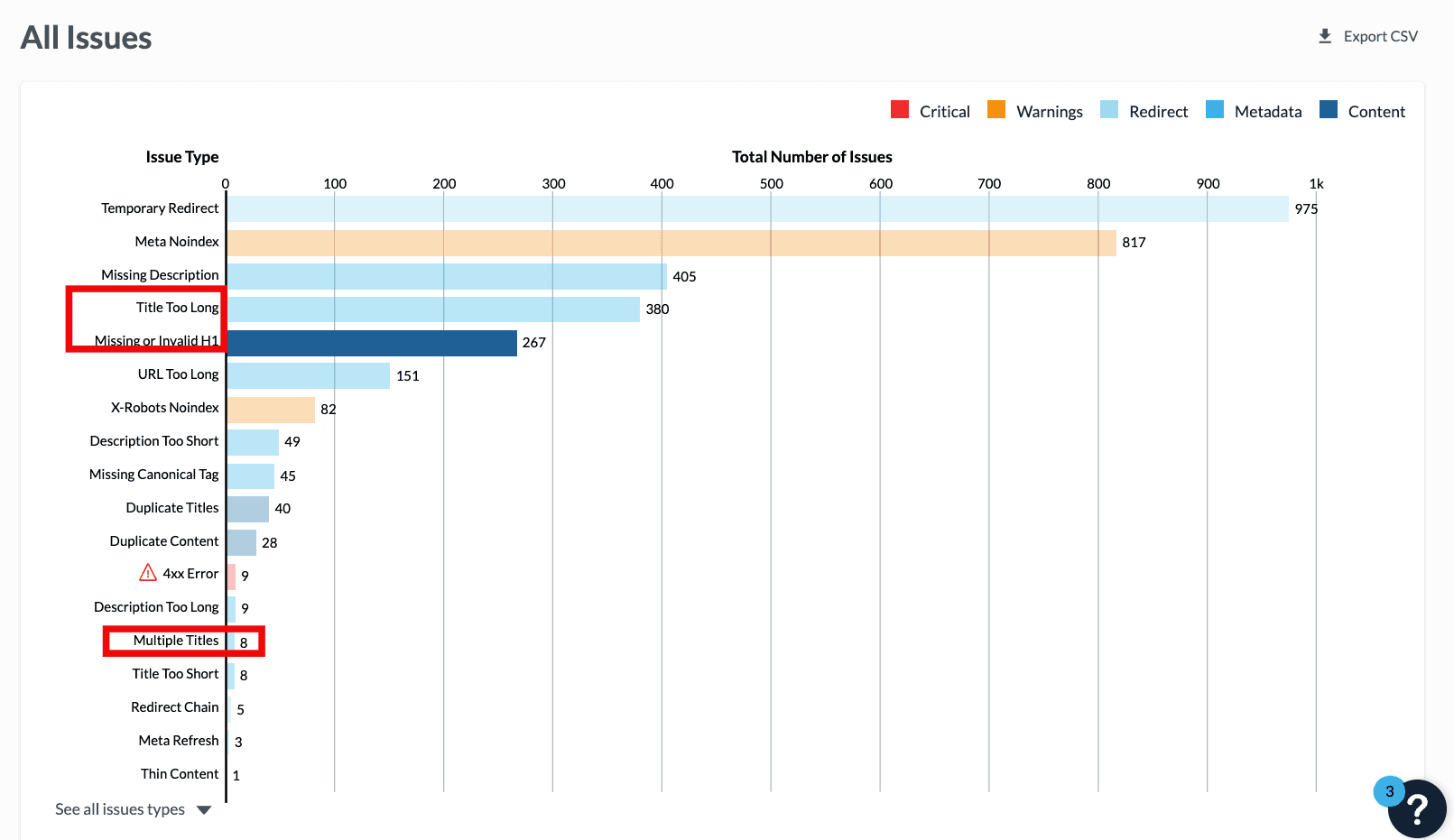 Scroll down to the Pages Crawled section and use the Issue Types dropdown to filter for title-specific issues.