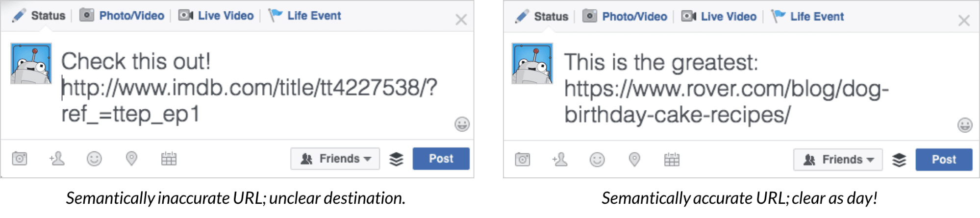 - Some websites (like Facebook, for example), may leave shared links completely unformatted. Unoptimized, semantically inaccurate URLs can look unwieldy, and instead of garnering clicks they actually deter them. Human-readable URLs provide users a better idea of what they'll be getting when they click the link.