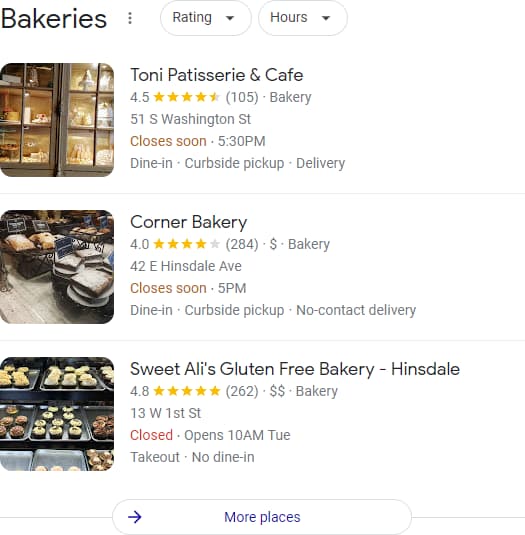 As an organic SEO, when you think of local search, you might think of the local/map pack, such as this local pack on a SERP for “bakery” in this suburban Chicago neighborhood: